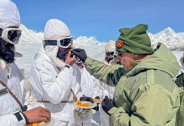 சியாச்சின் பனிமலையில் ராணுவ வீரர்களை சந்தித்த ராஜ்நாத்: இனிப்பு ஊட்டிவிட்டு உற்சாகம்