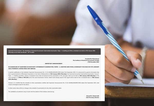 அதன் படி, ஜன,15க்கு பதில் ஜன.19ம் தேதி தேர்வு நடைபெறும் என்று அறிவிக்கப்பட்டு உள்ளது. மற்றைய தேர்வு தேதிகளில் எவ்வித மாற்றமும் செய்யப்படவில்லை. தேதி மாற்றப்பட்டாலும் ஏற்கனவே அனுப்பி வைக்கப்பட்டுள்ள தேர்வுக்கூட நுழைவுச்சீட்டுகள் செல்லுபடியாகும். மஹாராஷ்டிரா உள்ளாட்சித் தேர்தல் காரணமாக தேர்வு தேதி மாற்றப்பட்டு உள்ளதாக தமது அதிகாரப்பூர்வ அறிவிப்பில் பட்டயக் கணக்காளர்கள் கழகம் குறிப்பிட்டு உள்ளது.