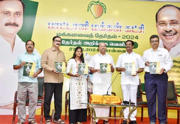 லோக்சபா தேர்தலுக்காக, பா.ம.க., தேர்தல் அறிக்கையை அக்கட்சியின் நிறுவனர் ராமதாஸ், தலைவர் அன்புமணி ஆகியோர் நேற்று வெளியிட்டனர்.