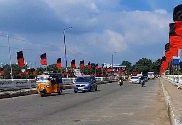 திருநெல்வேலியில் நேற்று அமைச்சர் நேரு பங்கேற்ற தி.மு.க., நிர்வாகிகள் ஆலோசனை கூட்டத்திற்காக ஆற்றுப்பாலம் முழுதும் இரு புறங்களிலும், ட்ரில் மெஷின் கொண்டு ஓட்டை போட்டு, இரும்பு கம்பிகளில் கட்சி கொடிகளை ஏற்றினர்.