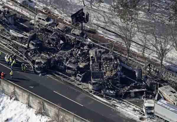 இதனால், மினகாமி நகரில் இரு லாரிகள் மோதி விபத்துக்குள்ளாகின. அதன்பிறகு, பனி காரணமாக பிரேக் செயலிழந்து, ஒன்றன் பின் ஒன்றாக சுமார் 60க்கும் மேற்பட்ட வாகனங்கள் மோதியுள்ளன. இதில், 20 கார்கள் தீயில் எரிந்து நாசமாகின. 7 மணிநேரம் போராட்டத்திற்கு பிறகு தீயணைக்கப்பட்டது. இந்த விபத்தில் 2 பேர் உயிரிழந்துள்ளனர். 25க்கும் மேற்பட்டோர் காயமடைந்துள்ளனர்.