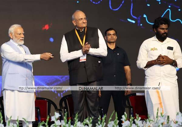 மதுரையில் சிறு, குறுந்தொழில் முனைவோருக்கான டி.வி.எஸ்., மொபிலிட்டி டிஜிட்டல் தளத்தை பிரதமர் மோடி துவக்கி வைத்தார். அருகில் மத்திய அமைச்சர் முருகன், பா.ஜ., மாநில தலைவர் அண்ணாமலை.