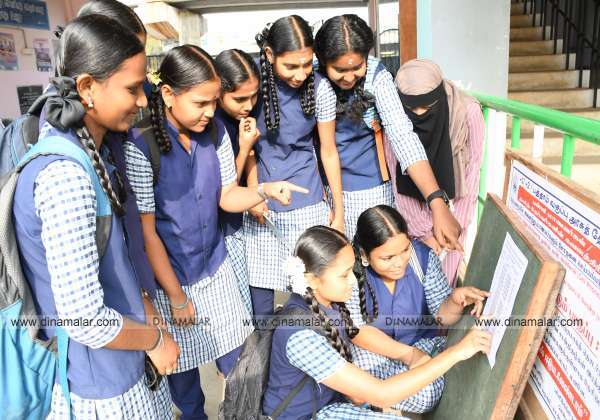 இன்று துவங்கிய பிளஸ் 1 அரசு பொதுத் தேர்வு எழுதுவற்கு முன்னதாக மாணவிகள் தேர்வு அறை எண்ணை பார்த்தனர். இடம்: பாரதியார் நூற்றாண்டு அரசு பெண்கள் மேல்நிலைப்பள்ளி, உடுமலை