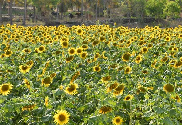 விவசாய நிலத்தில் பயிரிடப்பட்ட சூரியகாந்தி பூ பூத்துக் குலுங்கும் காட்சி. இடம்: மோட்டூர், திருவண்ணாமலை