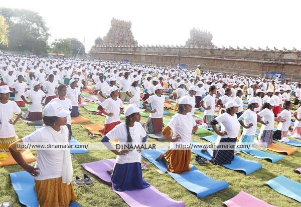 சர்வதேச யோகா தினத்தை முன்னிட்டு, தஞ்சாவூர் பெரிய கோவில் பின்புறம், ஏராளமானோர் யோகா மேற்கொண்டனர்.