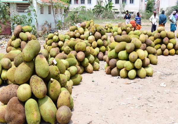சித்திரக்கனியை முன்னிட்டு கோவை புல்லுக்காடு பழம் மார்க்கெட்டில் விற்பனைக்கு குவிந்துள்ள பலாப்பழங்கள்.