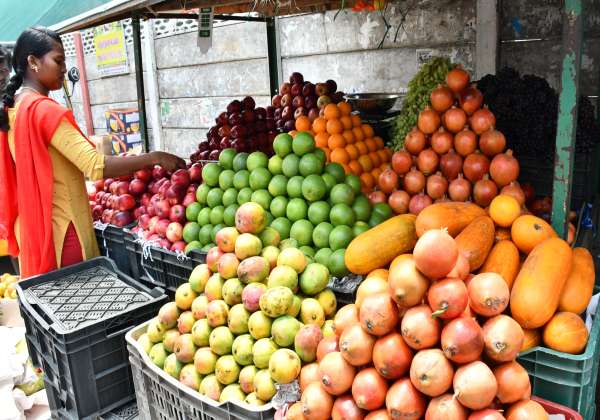 தமிழ்ப் புத்தாண்டை முன்னிட்டு பழங்கள் விற்பனை நடந்தது. இடம்: திருப்பூர், பெருமாள் கோவில் வீதி.