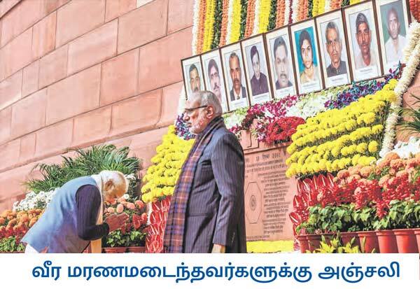 பார்லிமென்ட் மீது 2001 டிசம்பர் 13ல் பயங்கரவாதிகள் தாக்குதல் நடத்தினர். இதில் பாதுகாப்பு படையினர் உட்பட 10 பேர் உயிரிழந்தனர். நினைவு தினத்தில் வீர மரணம் அடைந்தவர்களின் புகைப்படங்களுக்கு பிரதமர் மோடி அஞ்சலி செலுத்தினார். உடன் துணை ஜனாதிபதி சி.பி.ராதாகிருஷ்ணன்.